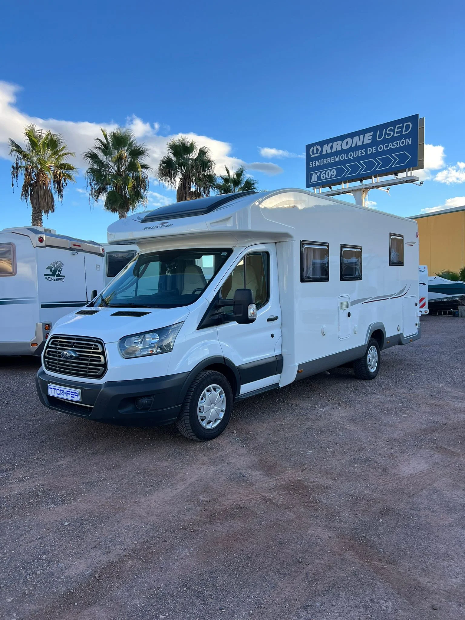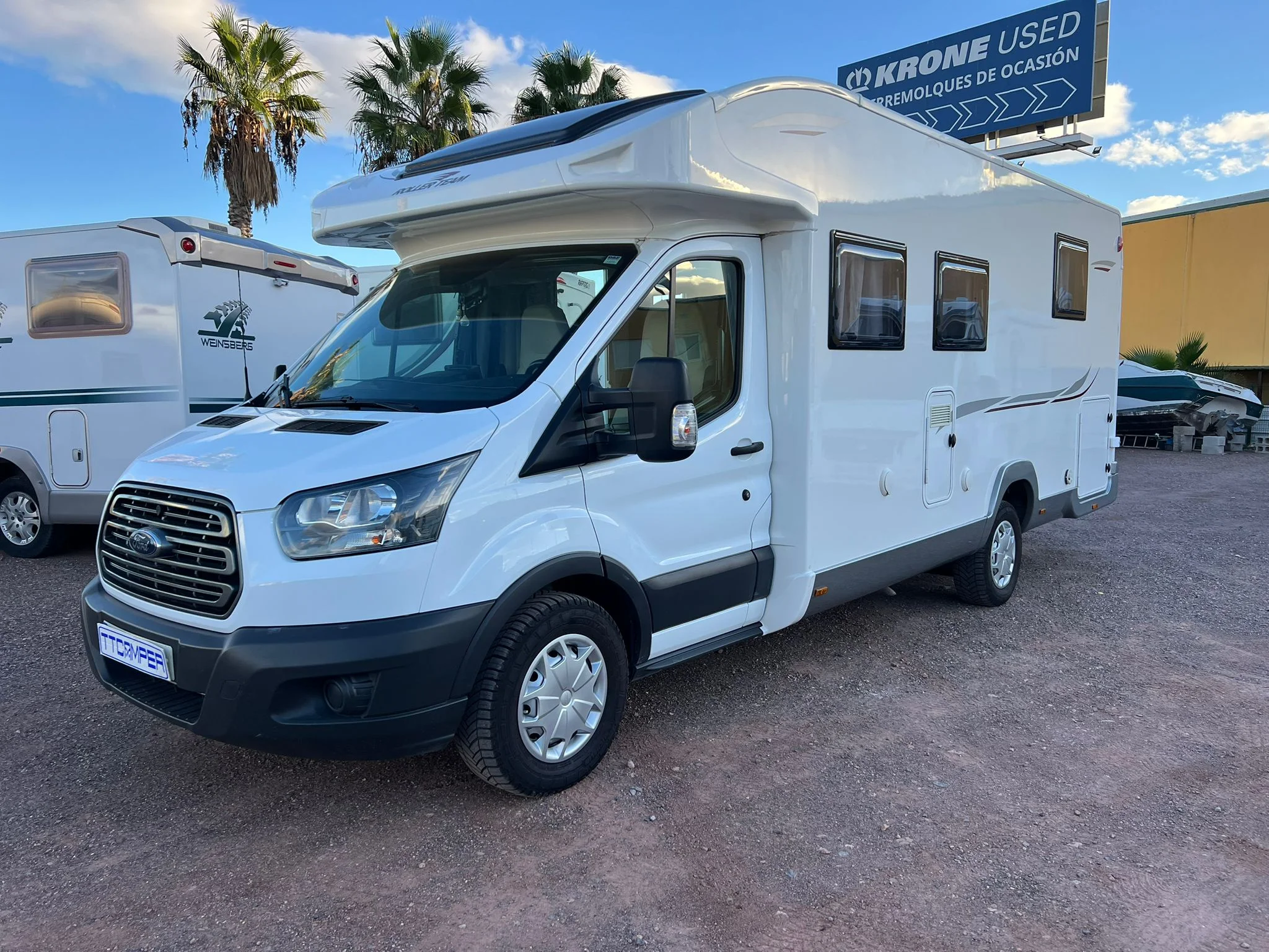 Bedroom with island bed Second automatic tilting bed Air conditioning in CABIN AND PASSENGER TRUMA Heating and hot water Auxiliary cabin battery and solar panel with regulator Swivel front seats Kitchen with large and automatic trivalent refrigerator, cabinets and hob with three burners Toilet with toilet, sink and separate shower in different cabins Large L-shaped living room with side sofa Control center Awning and exterior lighting Large garage with double opening Rear camera Large storage space TV and antenna Bicycle rack Skylights and windows with mosquito nets and blinds