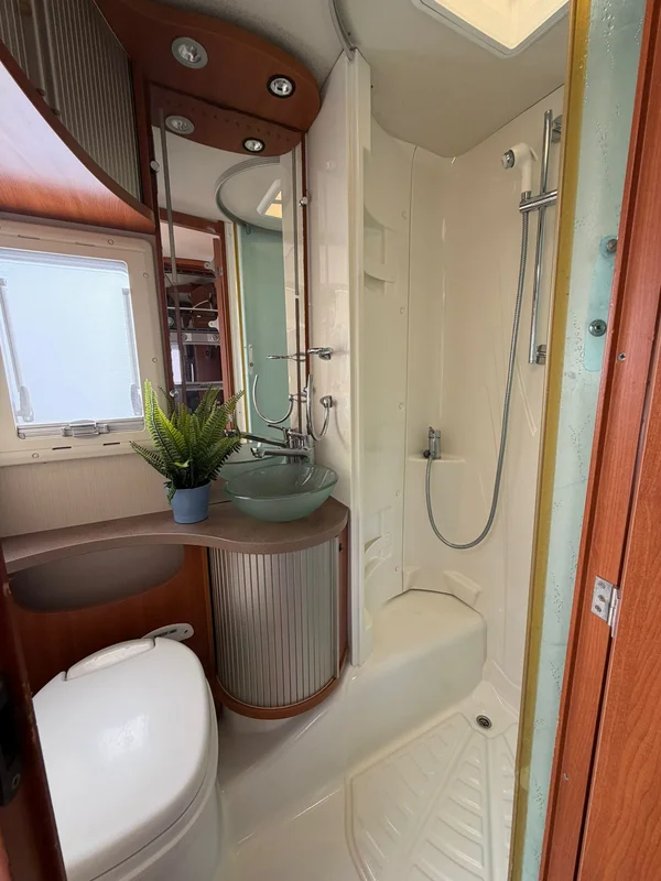 Dormitorio con cama Transversal Aire acondicionado en CABINA y HABITACULO Calefacción y agua caliente TRUMA Batería auxiliar de habitáculo y placa solar con regulador Asientos delanteros giratorios Cocina con nevera trivalente, armarios, placa con tres fuegos Horno Aseo con wc, lavabo y ducha con mampara Amplio salon Centro de control Toldo e iluminación exterior Garaje amplio Cámara trasera Porta bicicletas Gran espacio de almacenaje Tv y antena Claraboyas y ventanas con mosquiteras y oscurecedores